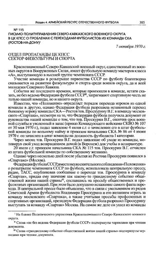 Письмо Политуправления Северо-Кавказского военного округа в ЦК КПСС о проблемах с переходами футболистов из команды СКА (Ростов-на-Дону). 7 октября 1970 г.