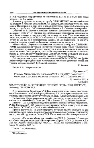 Приложение 2 к заявлению в ЦК КПСС П.Ф. Ольшанского. Справка Министерства обороны СССР в ЦК КПСС по вопросу о призыве на военную службу футболиста С.П. Ольшанского. 23 октября 1975 г.