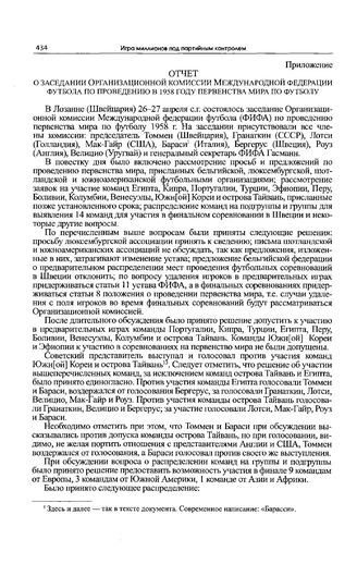 Приложение к записке Спорткомитета СССР в ЦК КПСС. Отчет о заседании Организационной комиссии Международной федерации футбола по проведению в 1958 году первенства мира по футболу // РГАНИ. Ф. 5. Оп. 47. Д. 167. Л. 172-175. Подлинник.
