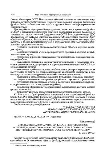 Приложение к информации Спорткомитета СССР в ЦК КПСС. Справка отдела пропаганды ЦК КПСС о некоторых мерах по ликвидации отставания в развитии футбола в связи с итогами выступления сборной команды СССР на IX чемпионате мира. 14 июня 1970 г. // РГАНИ. Ф. 5. Оп. 62. Д. 48. Л. 81-82. Подлинник.