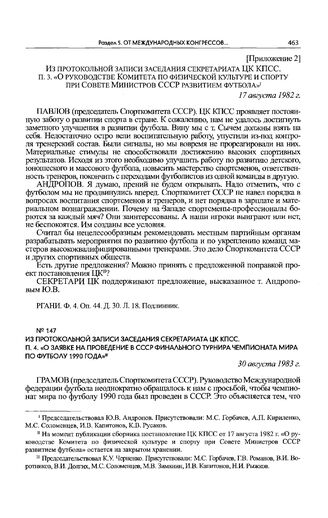 Из протокольной записи заседания Секретариата ЦК КПСС. П. 4. «О заявке на проведение в СССР финального турнира чемпионата мира по футболу 1990 года». 30 августа 1983 г.