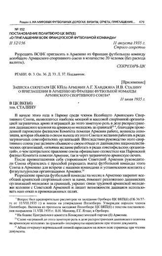 Приложение к постановлению Политбюро ЦК ВКП(б). Записка секретаря ЦК КП(б) Армении А.Г. Ханджяна И.В. Сталину о приглашении в Армению из Франции футбольной команды Армянского спортивного союза. 11 июля 1935 г. // РГАНИ. Ф. 3. Оп. 36. Д. 33. Л. 39. Подлинник.