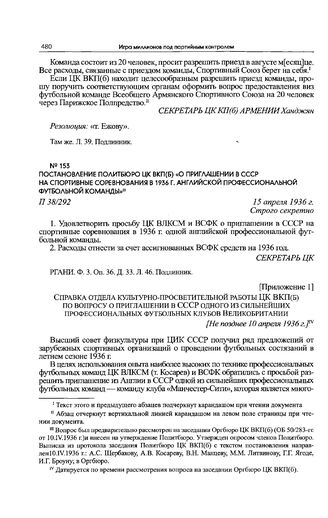 Постановление Политбюро ЦК ВКП(б) «О приглашении в СССР на спортивные соревнования в 1936 г. английской профессиональной футбольной команды». 15 апреля 1936 г.
