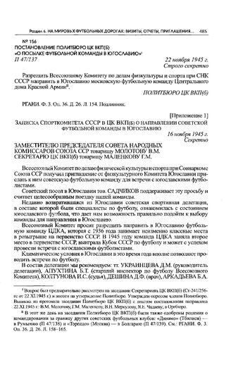 Приложение 1 к постановлению Политбюро ЦК ВКП(б). Записка Спорткомитета СССР в ЦК ВКП(б) о направлении советской футбольной команды в Югославию. 16 ноября 1945 г. // РГАНИ. Ф. 3. Оп. 36. Д. 26. Л. 156. Подлинник.