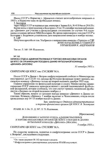 Приложение к записке отдела административных и торгово-финансовых органов ЦК КПСС. Дополнение к записке отдела административных и торгово-финансовых органов ЦК КПСС о поездке в Данию футбольной команды «Динамо» (Москва). 5 ноября 1953 г. // РГАНИ. Ф. 5. Оп. 21. Д. 587. Л. 76-77. Подлинник.