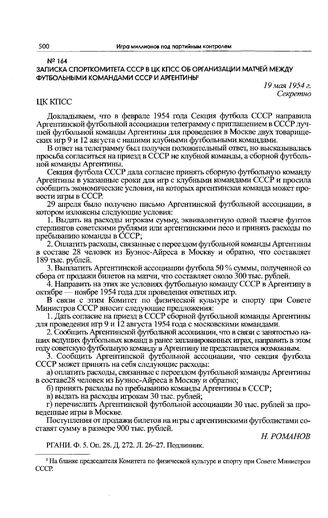 Записка Спорткомитета СССР в ЦК КПСС об организации матчей между футбольными командами СССР и Аргентины. 19 мая 1954 г. // РГАНИ. Ф. 5. Оп. 28. Д. 272. Л. 26-27. Подлинник.
