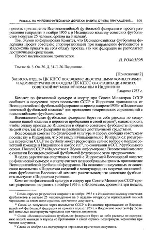 Приложение 2 к постановлению Президиума ЦК КПСС. Записка отдела ЦК КПСС по связям с иностранными компартиями и административного отдела ЦК КПСС об организации визита советской футбольной команды в Индонезию. 3 марта 1955 г. // РГАНИ. Ф. 3. Оп. 10. Д. 132. Л. 24-25. Подлинник.