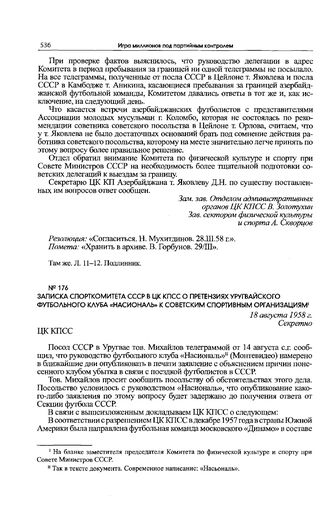 Записка Спорткомитета СССР в ЦК КПСС о претензиях уругвайского футбольного клуба «Насиональ» к советским спортивным организациям. 18 августа 1958 г.