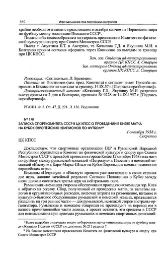 Записка Спорткомитета СССР в ЦК КПСС о проведении в Киеве матча на Кубок европейских чемпионов по футболу. 4 октября 1958 г.