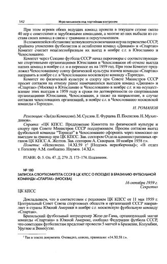 Записка Спорткомитета СССР в ЦК КПСС о поездке в Бразилию футбольной команды «Спартак» (Москва). 16 октября 1959 г.