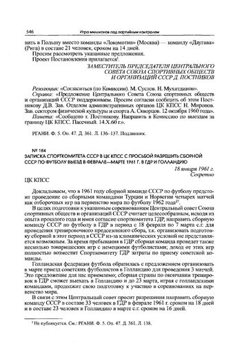 Записка Спорткомитета СССР в ЦК КПСС с просьбой разрешить сборной СССР по футболу выезд в феврале — марте 1961 г. в ГДР и Голландию. 18 января 1961 г.