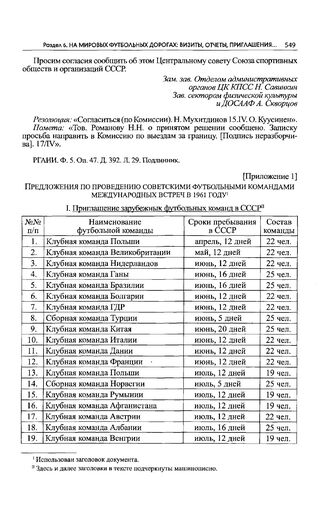 Приложение 1 к информационной записке отдела административных органов ЦК КПСС. Предложения по проведению советскими футбольными командами международных встреч в 1961 году