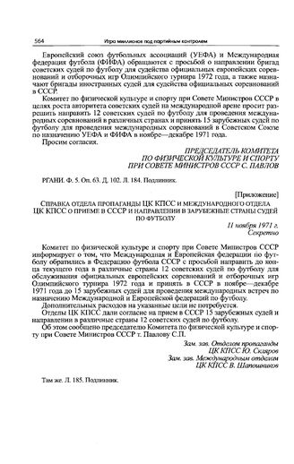 Приложение к записке Спорткомитета СССР в ЦК КПСС. Справка отдела пропаганды ЦК КПСС и международного отдела ЦК КПСС о приеме в СССР и направлении в зарубежные страны судей по футболу. 11 ноября 1971 г. // РГАНИ. Ф. 5. Оп. 63. Д. 102. Л. 185. Подлинник.