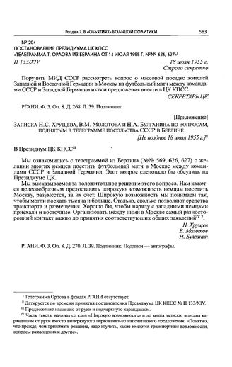 Приложение к постановлению Президиума ЦК КПСС. Записка Н.С. Хрущева, В.М. Молотова и Н.А. Булганина по вопросам, поднятым в телеграмме посольства СССР в Берлине. [Не позднее 18 июля 1955 г.