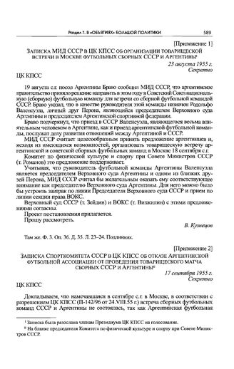 Приложение 2 к постановлению Президиума ЦК КПСС. Записка Спорткомитета СССР в ЦК КПСС об отказе Аргентинской футбольной ассоциации от проведения товарищеского матча сборных СССР и Аргентины. 17 сентября 1955 г.