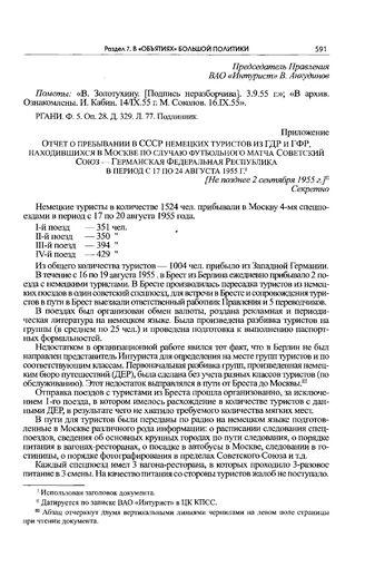 Приложение к записке BAO «Интурист» в ЦК КПСС. Отчет о пребывании в СССР немецких туристов из ГДР и ГФР, находившихся в Москве по случаю футбольного матча Советский Союз — Германская Федеральная Республика в период с 17 по 24 августа 1955 г. [Не позднее 2 сентября 1955 г. // РГАНИ. Ф. 5. Оп. 28. Д. 329. Л. 78-87. Подлинник.