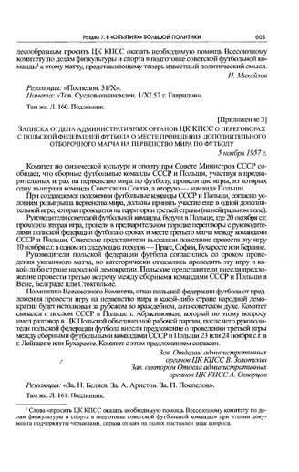 Приложение 3 к справке отдела административных органов ЦК КПСС. Записка отдела административных органов ЦК КПСС о переговорах с польской федерацией футбола о месте проведения дополнительного отборочного матча на первенство мира по футболу. 5 ноября 1957 г.