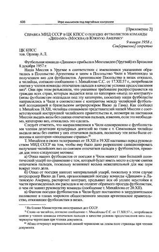 Приложение 2 к постановлению Секретариата ЦК КПСС. Справка МИД СССР в ЦК КПСС о поездке футболистов команды «Динамо» (Москва) в Южную Америку. 9 января 1958 г. // РГАНИ. Ф. 4. Оп. 16. Д. 453. Л. 47-48. Подлинник.