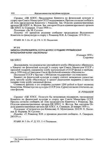 Записка Спорткомитета СССР в ЦК КПСС о подарке уругвайскому футбольному клубу «Насиональ». 16 января 1959 г.