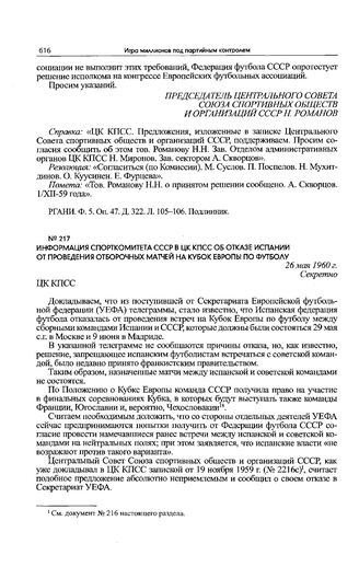 Информация Спорткомитета СССР в ЦК КПСС об отказе Испании от проведения отборочных матчей на Кубок Европы по футболу. 26 мая 1960 г. // РГАНИ. Ф. 5. Оп. 47. Д. 361. Л. 83-84. Подлинник.