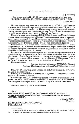 Приложение к информации Спорткомитета СССР в ЦК КПСС. Справка отделов ЦК КПСС о проведении отборочных матчей чемпионата Европы по футболу между сборными СССР и Греции. 3 июля 1967 г.