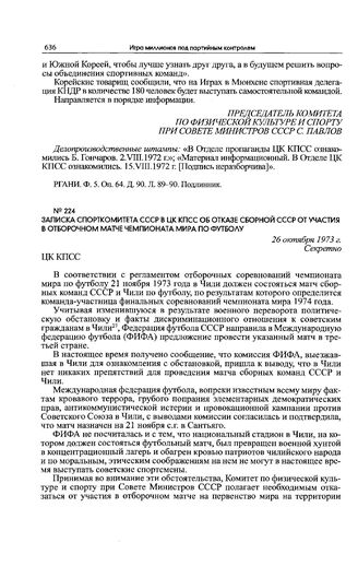 Записка Спорткомитета СССР в ЦК КПСС об отказе сборной СССР от участия в отборочном матче чемпионата мира по футболу. 26 октября 1973 г. // РГАНИ. Ф. 4. Оп. 22. Д. 1756. Л. 29-30. Подлинник.