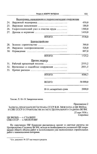 Приложение 2 к постановлению Политбюро ЦК ВКП(б). Записка председателя Госплана СССР В.И. Межлаука в ЦК ВКП(б) и СНК СССР о строительстве и смете Центрального стадиона ВСФК. 25 мая 1936 г. // РГАНИ. Ф. 3. Оп. 36. Д. 17. Л. 20- 21. Подлинник.