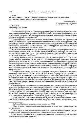 Записка НКВД СССР И.В. Сталину об упорядочении практики раздачи бесплатных билетов на футбольные матчи. 21 июня 1940 г.