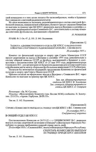 Приложение 1 к записке Спорткомитета СССР в ЦК КПСС. Записка административного отдела ЦК КПСС о направлении в Венгрию спортивного радиокомментатора В.С. Синявского. 20 сентября 1955 г. // РГАНИ. Ф. 5. Оп. 47. Д. 105. Л. 162. Подлинник.