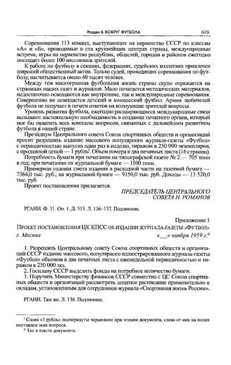 Приложение 1 к записке Спорткомитета СССР в ЦК КПСС. Проект постановления ЦК КПСС об издании журнала-газеты «Футбол». Ноябрь 1959 г.