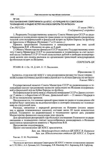Постановление Секретариата ЦК КПСС «О передаче по советскому телевидению и радио встреч на кубок Европы по футболу». 11 июня 1964 г.