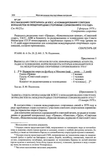Постановление Секретариата ЦК КПСС «О командировании советских журналистов на международные спортивные соревнования в 1970 году». 2 февраля 1970 г.