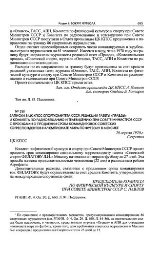Записки в ЦК КПСС Спорткомитета СССР, редакции газеты «Правды» и Комитета по радиовещанию и телевидению при Совете Министров СССР с просьбами о продлении срока командировок советских корреспондентов на чемпионате мира по футболу в Мексике. Апрель-...
