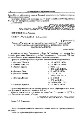 Приложение 1 к письму Спорткомитета Грузинской ССР в ЦК КПСС, ЦК ВЛКСМ и газету «Комсомольская правда». Справка Управления футбола Спорткомитета Грузинской ССР о подготовке команд высшей лиги на футбольных полях пансионата «Спорт». 12 марта 1978 г.
