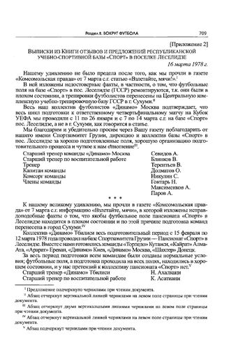 Приложение 2 к письму Спорткомитета Грузинской ССР в ЦК КПСС, ЦК ВЛКСМ и газету «Комсомольская правда». Выписки из Книги отзывов и предложений республиканской учебно-спортивной базы «Спорт» в поселке Леселидзе. 16 марта 1978 г. // РГАНИ. Ф. 5. Оп. 75. Д. 311. Л. 4, 6-8. Заверенные копии.