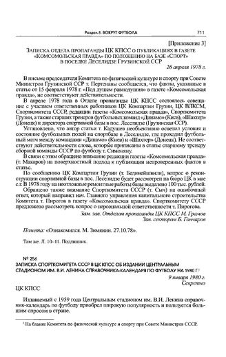 Записка Спорткомитета СССР в ЦК КПСС об издании Центральным стадионом им. В.И. Ленина справочника-календаря по футболу на 1980 г. 9 января 1980 г.