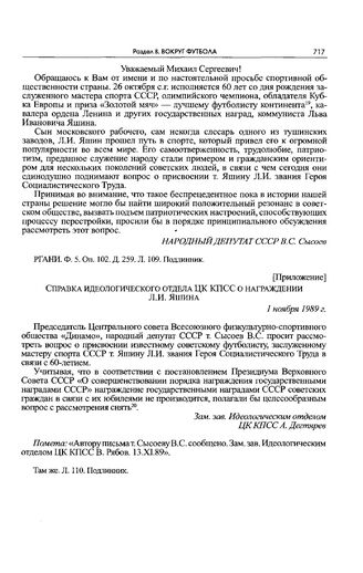 Приложение к письму народного депутата СССР В.С. Сысоева председателю Президиума Верховного Совета СССР М.С. Горбачеву. Справка идеологического отдела ЦК КПСС о награждении Л.И. Яшина. 1 ноября 1989 г.