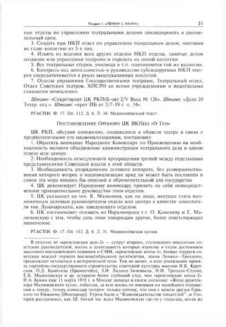 Материалы к постановлению Оргбюро ЦК ВКП(б) о театральном отделе. Постановление Оргбюро ЦК ВКП(б) «О Тео» // РГАСПИ. Ф. 17. Оп. 112. Д. 6. Л. 31. Машинописная копия.