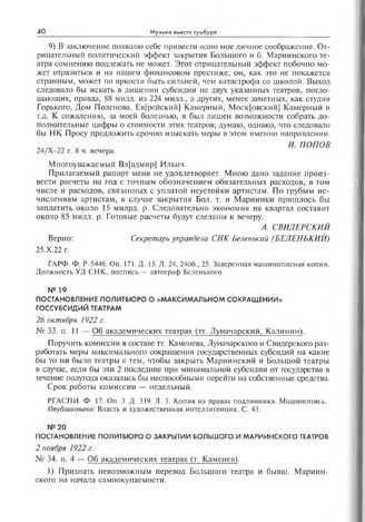 Постановление Политбюро о «максимальном сокращении» госсубсидий театрам. 26 октября 1922 г. // РГАСПИ. Ф. 17. Оп. 3. Д. 319. Л. 3. Копия на правах подлинника. Машинопись. Опубликовано: Власть и художественная интеллигенция. С. 43.