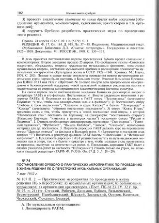 Постановление Оргбюро о практических мероприятиях по проведению в жизнь решения ПБ о перестройке музыкальных организаций. 7 мая 1932 г. // Опубликовано: Власть и художественная интеллигенция. Стр. 175.