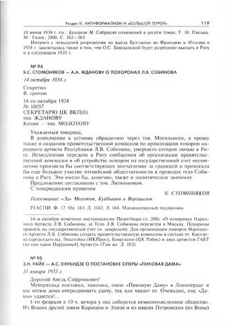 Б.С. Стомоняков - А.А. Жданову о похоронах Л.В. Собинова. 14 октября 1934 г.