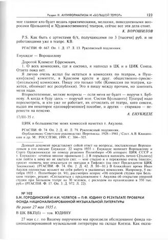 Обмен письмами между К.Е. Ворошиловым и А.С. Енукидзе по поводу работы Енукидзе в творческих комиссиях. Енукидзе — Ворошилову. Не ранее 17 марта 1935 г. // РГАСПИ. Ф. 74. Оп. 2. Д. 41. Л. 79. Рукописный подлинник. Опубликовано: Советское руководство. Переписка. 1928—1941 /Сост. А. В. Квашонкин и др. М.: РОССПЭН, 1999. С. 304-305.
