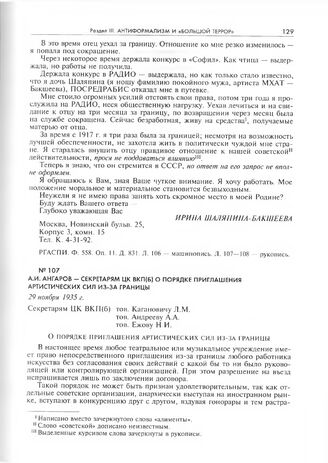 А.И. Ангаров - секретарям ЦК ВКП(б) о порядке приглашения артистических сил из-за границы. 29 ноября 1935 г. // РГАСПИ. Ф. 17. Оп. 114. Д. 948. Л. 112-113. Машинописный подлинник.