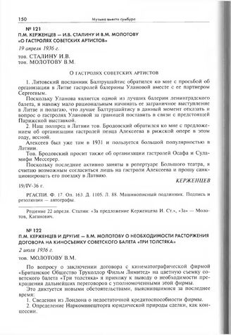 П.М. Керженцев - И.В. Сталину и В.М. Молотову «О гастролях советских артистов». 19 апреля 1936 г.