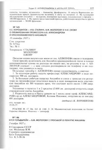 К.Е. Ворошилов - И.В. Сталину, В.М. Молотову и Н.И. Ежову о премировании профессора А.В. Александрова и Краснознаменного ансамбля. 19 сентября 1937 г.