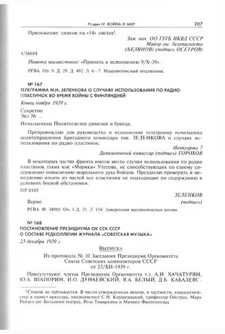 Постановление Президиума OK ССК СССР о составе редколлегии журнала «Советская музыка». 23 декабря 1939 г. // РГАСПИ. Ф. 17. Оп. 117. Д. 92. Л. 177. Заверенная машинописная копия.