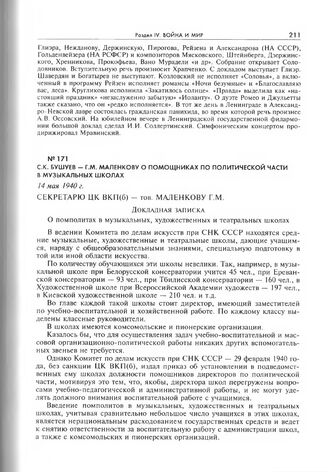 С.К. Бушуев - Г.М. Маленкову о помощниках по политической части в музыкальных школах. 14 мая 1940 г. // РГАСПИ. Ф. 17. Оп. 117. Д. 99. Л. 152-153. Машинописный подлинник.