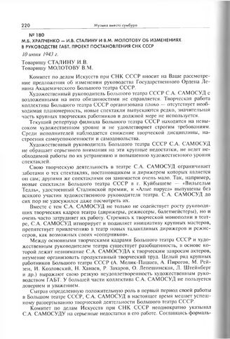 М.Б. Храпченко - И.В. Сталину и В.М. Молотову об изменениях в руководстве ГАБТ. Проект постановления СНК СССР. 10 июня 1943 г.