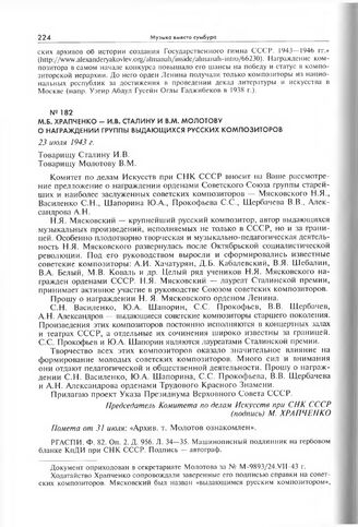 М.Б. Храпченко - И.В. Сталину и В.М. Молотову о награждении группы выдающихся русских композиторов. 23 июля 1943 г. // РГАСПИ. Ф. 82. Оп. 2. Д. 956. Л. 34-35. Машинописный подлинник на гербовом бланке КпДИ при СНК СССР.