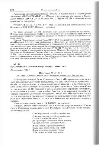 Постановление Политбюро ЦК ВКП(б) о гимне СССР. 25 сентября 1943 г. // РГАСПИ. Ф. 17. Оп. 163. Д. 1380. Л. 9-11. Машинописный подлинник.